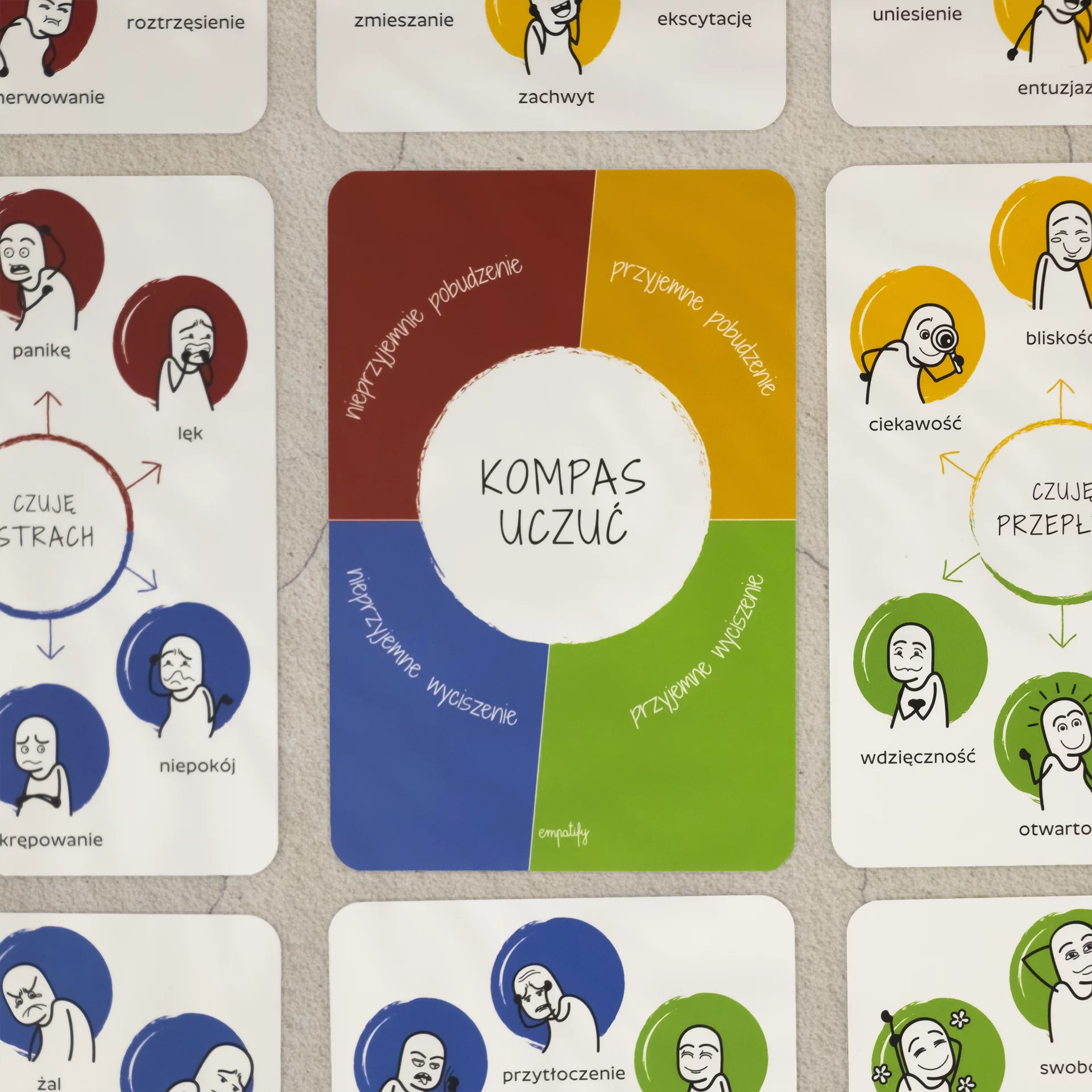 12 Ilustrowanych kart przedstawiajacych 72 podstawowe emocje pogrupowane w czytelny sposób.
